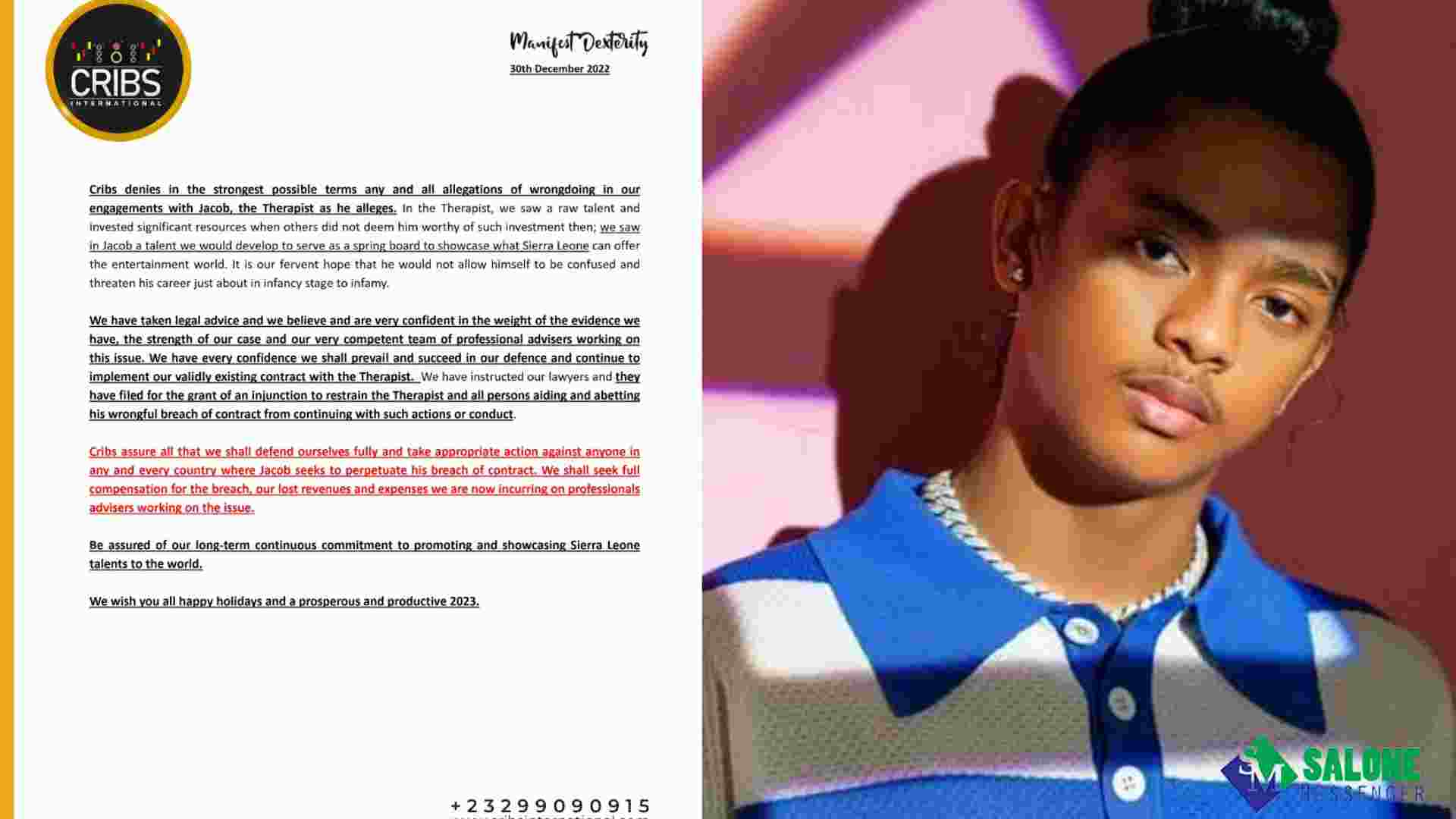 Cribs International one of the biggest entertainment company in Sierra Leone has denied any wrongdoing following the fallout of their signed artist Jacob The Therapist.