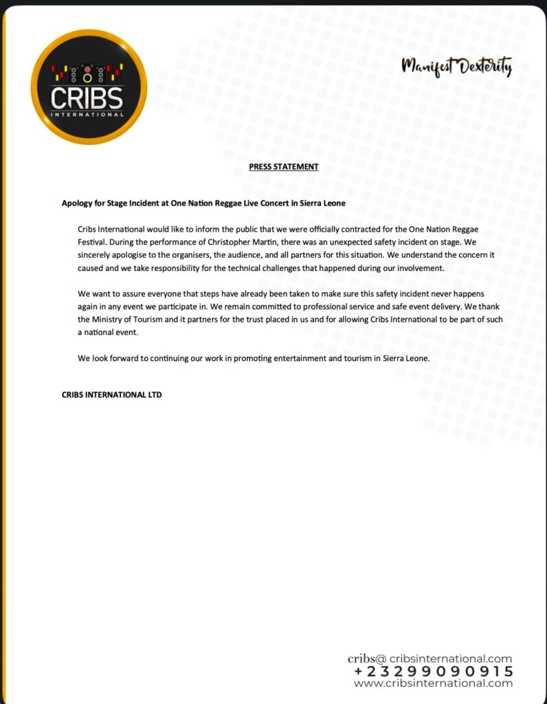 Cribs International has apologised to the public after a stage incident that happened during the One Nation Reggae Festival in Sierra Leone. The organisation confirmed that it was officially contacted to support the event and said the issue occurred while Jamaican singer Christopher Martin was performing.