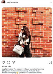 Just check the shades and the confident pose in front of that brick wall. Work it, Meghan! She also mentions that this is the closest she’ll ever be to channeling Beyonce; one could argue that she is closer now.
