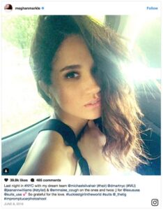 Here’s a pic that definitely shows Meghan at the top of her game: hair done, make-up perfected, pose sturck, all in an impromptu car photoshoot. The caption gives a shout-out to everyone who helped her look so glamorous, showing that she does not just wake up like this, as you may have imagined.