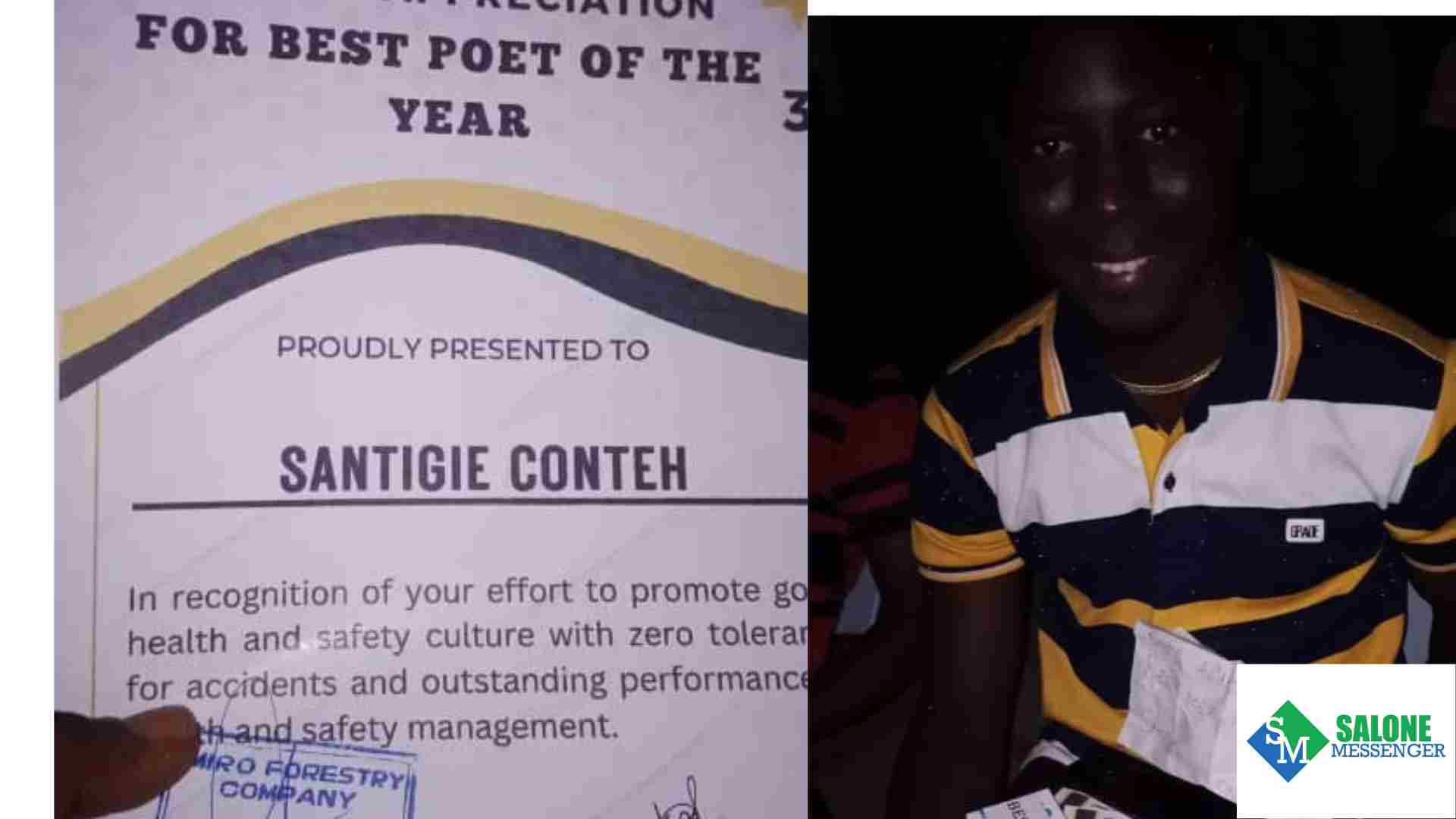 A young Sierra Leonean, Santigie Conteh has taken to his social media to celebrate after bagging 3rd best poet of the year at the Miro Forestry Company SL Limited poetry competition. Santigie , in a Facebook post, noted that this is the second time he has been rewarded for his skill.