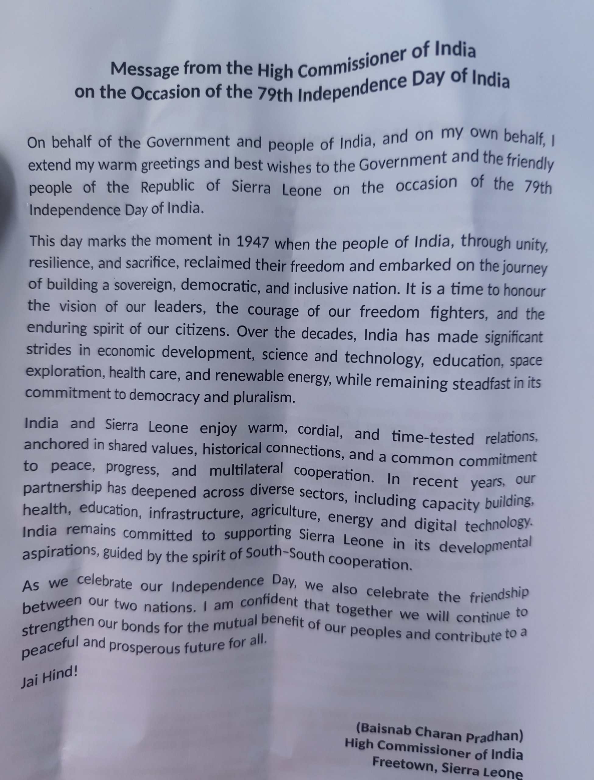 The High Commissioner of India to Sierra Leone, Baisnab Charan Pradhan, has extended warm greetings to the government and people of Sierra Leone as India marks its 79th Independence Day.