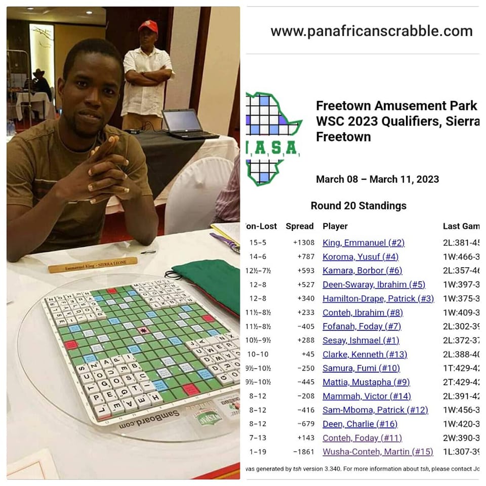 Emmanuel King, a junior lawyer at Nicol-Wilson & Co. (Malaika Chambers), has emerged as the champion of the Sierra Leone Scrabble tournament. He beat 15 other players to secure a spot at the 2023 World English Language Scrabble Players Association (WESPA) Championship, which is scheduled to take place in July in Las Vegas, USA. King won 15 out of the 20 games played, with a spread of +1308. Yusuf Koroma finished as the runner-up, winning 14 out of 20 games played, with a spread of +787. Abdul Borbor Kamara came in third place, winning 12.5 games with a spread of +527.