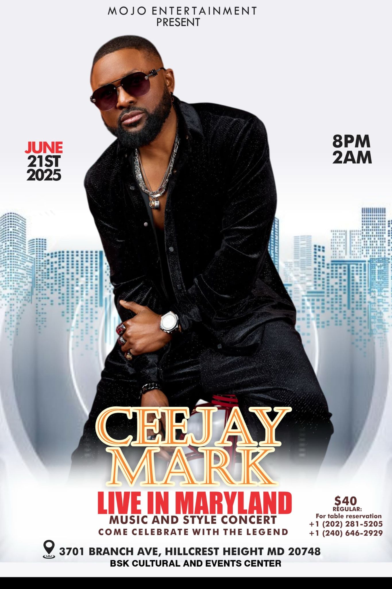 Sierra Leonean music legend and afrobeat singer Ceejay Mark, will be live in concert on June 21st, 2025, at the BSK Cultural and Event Center, located at 3701 Branch Ave, Hillcrest Heights, MD 20748. The show starts at 8 PM, and tickets are just $40.