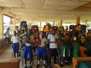 In the first Implementation, The organization targeted and distributed solar backpacks freely to seventy (70) disadvantaged school pupils in few communities around the township with support and funds from Purposeful Sierra Leone and Funds for Global Human Rights.